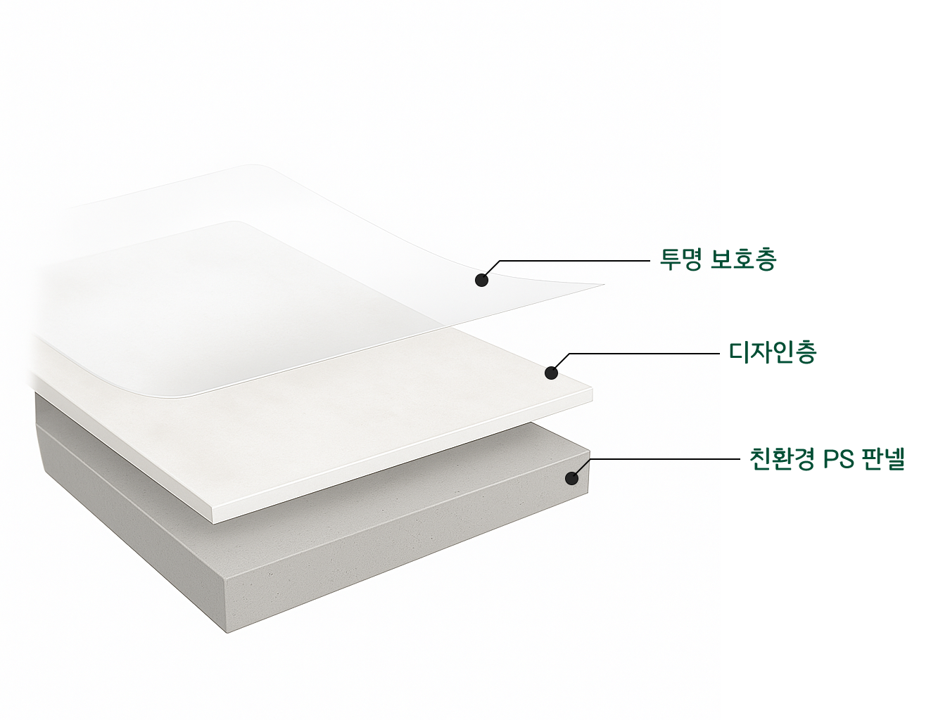 웰보드는 친환경 PS 판넬, 디자인 층, 투명 보호층